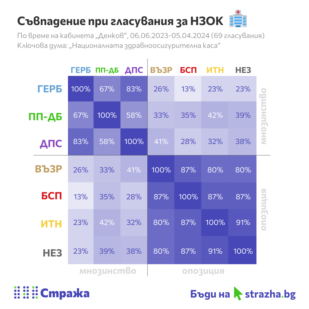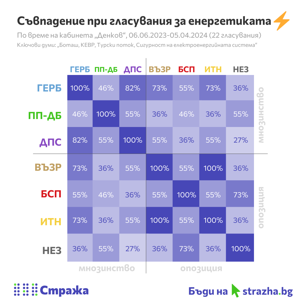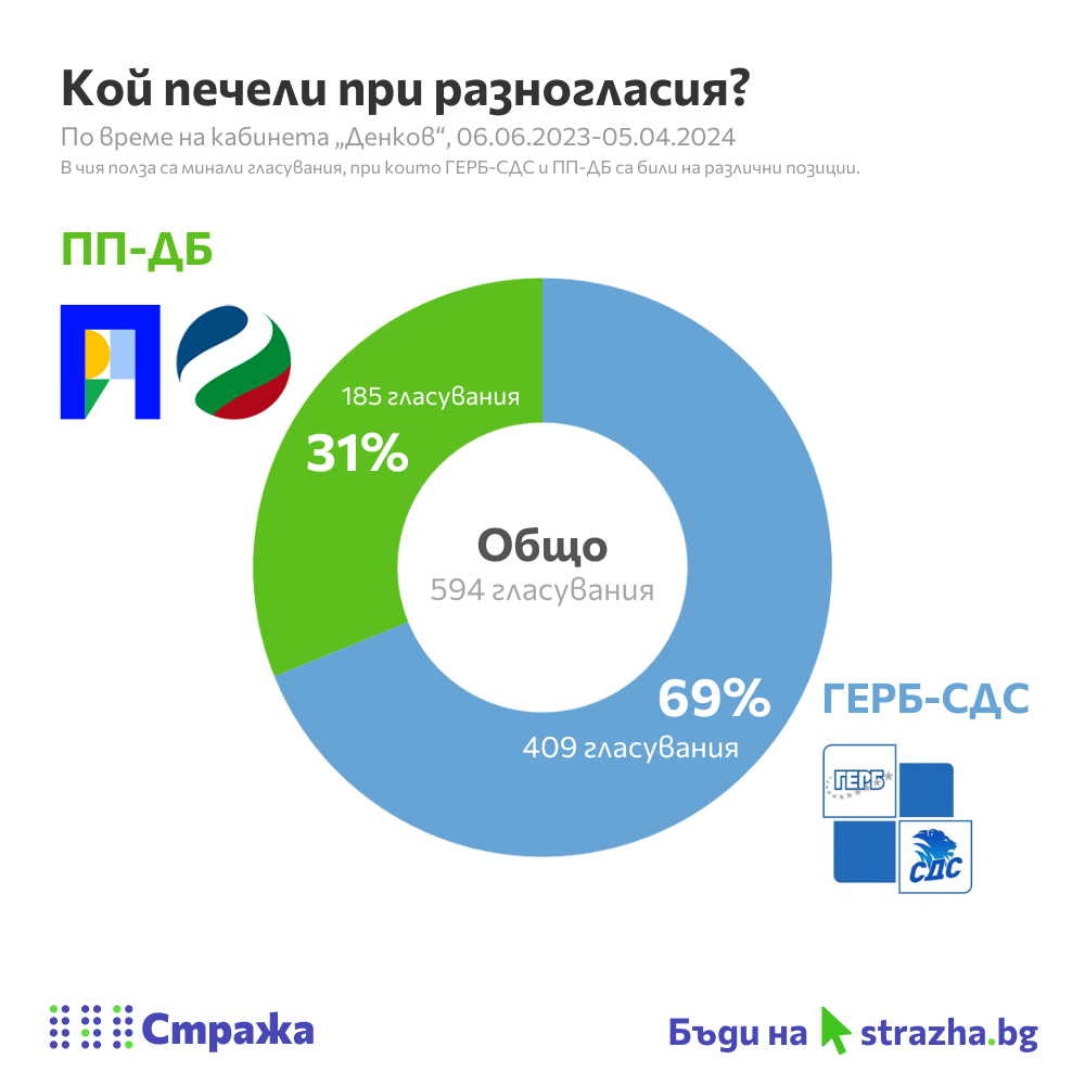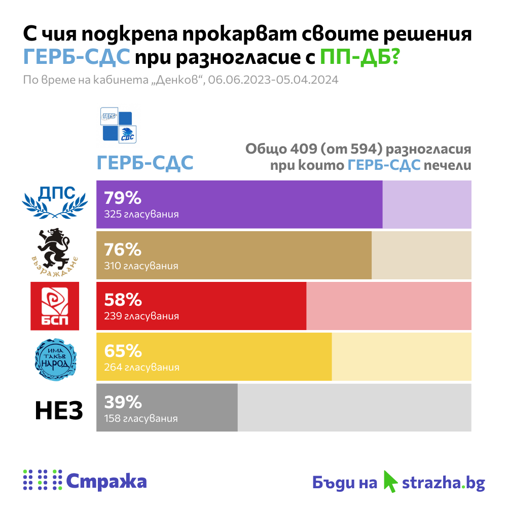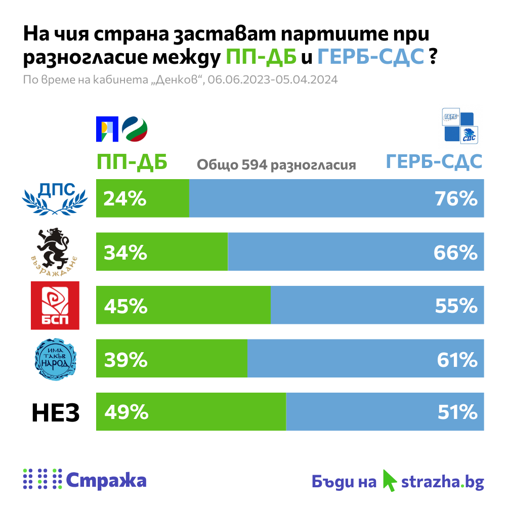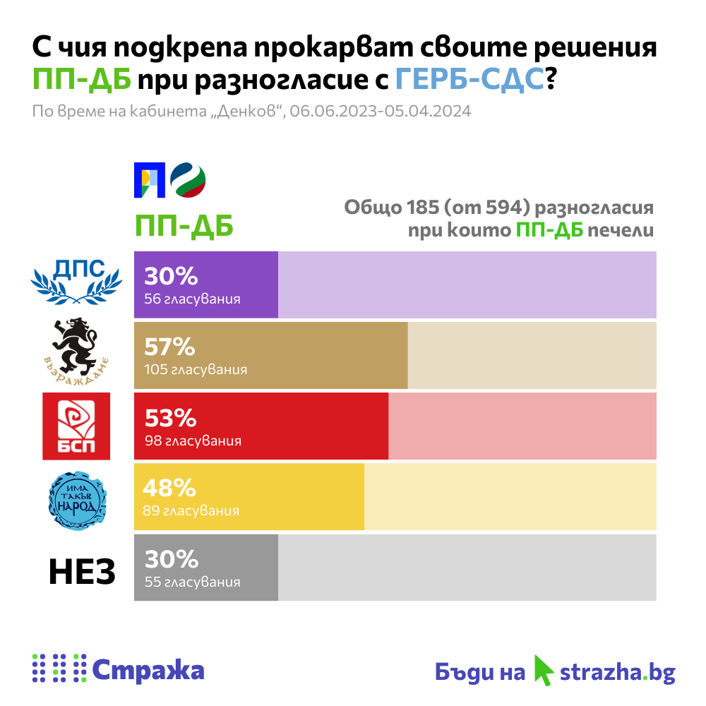 А когато ПП-ДБ печели разногласията си с ГЕРБ-СДС, най-често получава подкрепа от „Възраждане“ и от „БСП за България“. Отново ясно се вижда тенденцията ДПС да застава на страната ГЕРБ-СДС.