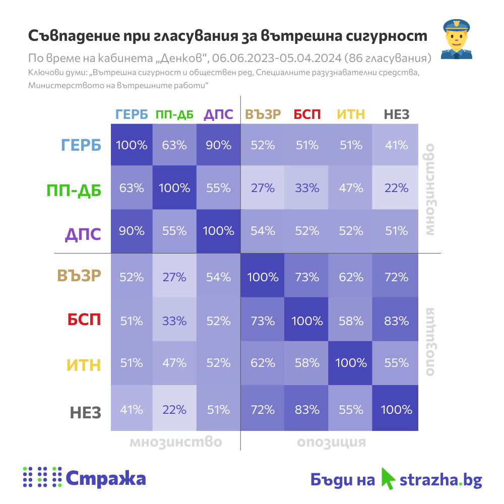 ГЕРБ-СДС и ПП-ДБ се разминават в 3 от 9 гласувания за избор на състав на Комисията за вътрешна сигурност и обществен ред, за разлика от пренебрежително малки различия при гласуванията за състав на други парламентарни комисии. Показателно е разногласието при почти половината гласувания на Закона за Министерството на вътрешните работи, който последно влиза в зала малко преди разпадането на „сглобката“ в края на март.