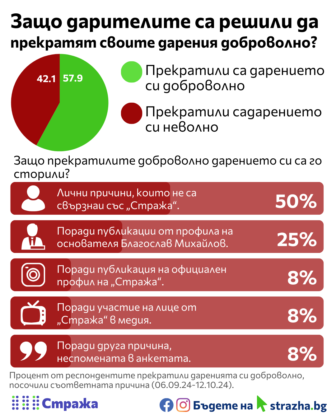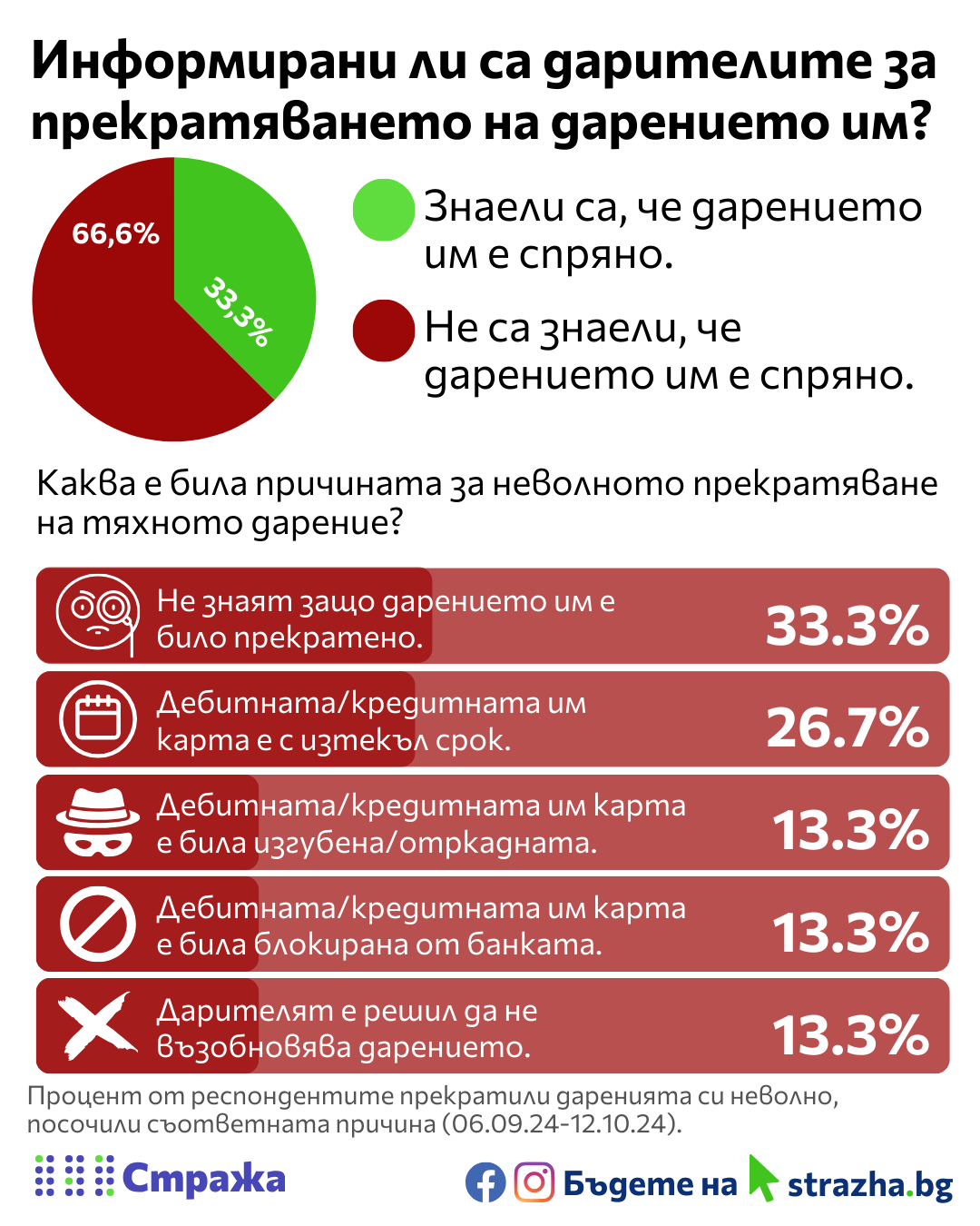 Сред прекратилите неволно дарението си към „Стража“, цели 66,6% не са знаели, че това се е случило. От тях 33,3% не знаят каква е причината тяхното дарение да бъде прекъснато, 26,7% посочват, че това се е случило поради изтекъл срок на тяхната кредитна/дебитна карта.