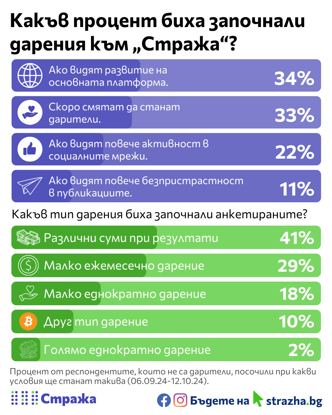 На въпросът „Бихте ли започнали дарение?“, последователите на „Стража“, които не са били дарители досега, отговарят по следния начин:
