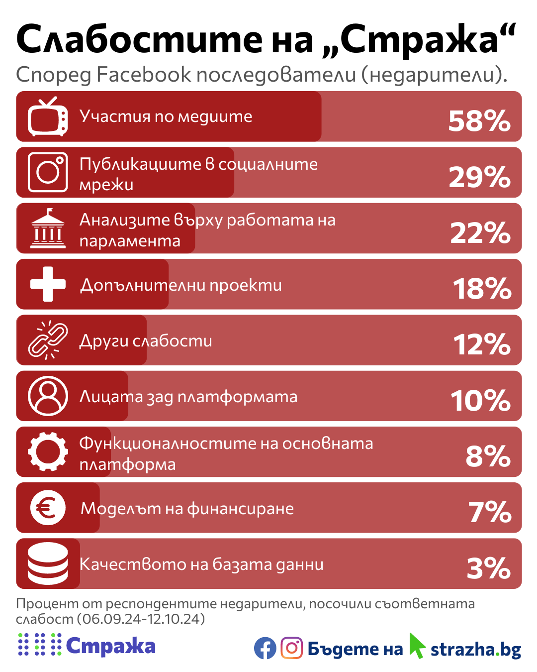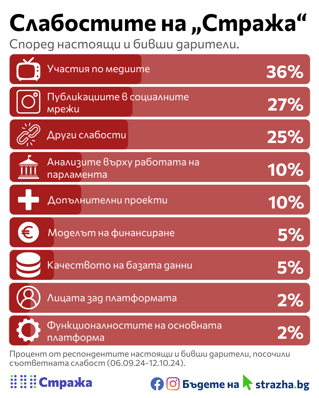 Според настоящите и бившите дарители на „Стража“, най-голямата слабост на уеб платформата е участието в медиите. За такава я посочват 36% от тях. Трудно е да се каже дали отговорилите виждат малкия брой или липсата на участията като недостатък, или тяхното качество.
