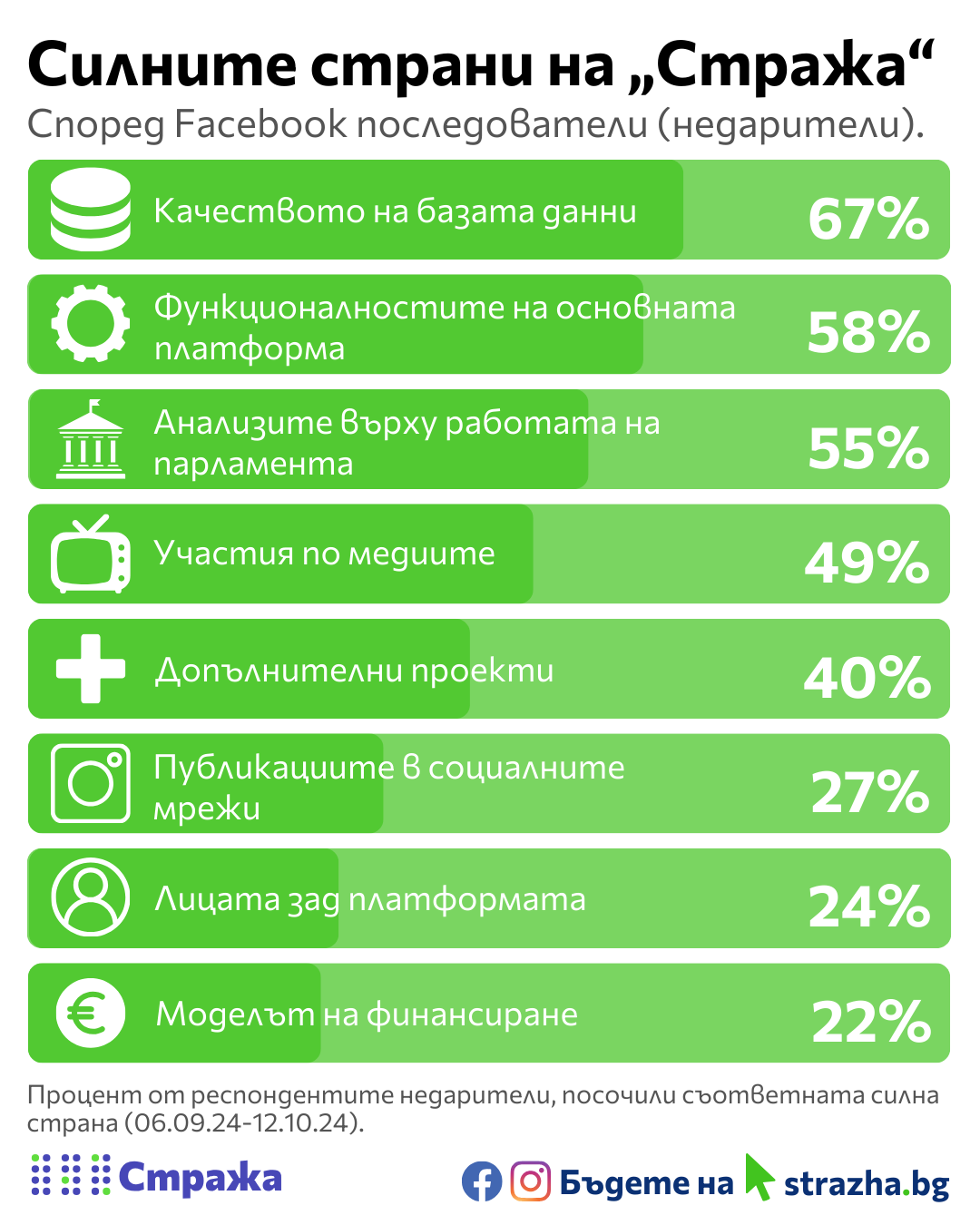 Сред взелите участие в анкетата недарители чрез публикацията в социалните мрежи, 67% от анкетираните позиционират качеството на базата данни като най-силна страна на уеб платформата. 58% от тях смятат за силна черта функционалностите ѝ, 55% анализите върху работата на парламента и 49% участията по медиите.