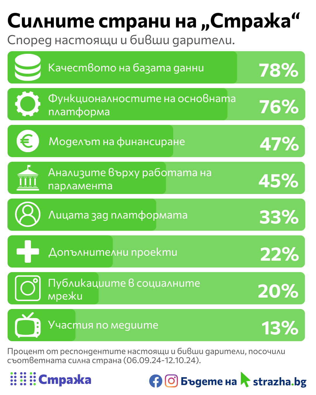 Според нашите настоящи и бивши дарители, двете безспорно най-силни страни са качеството на базата данни, като 78% от респондентите подкрепят тази опция и 76% отбелязват и функционалностите на основната платформа.