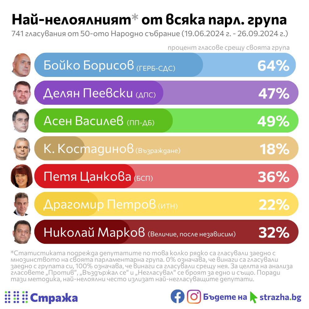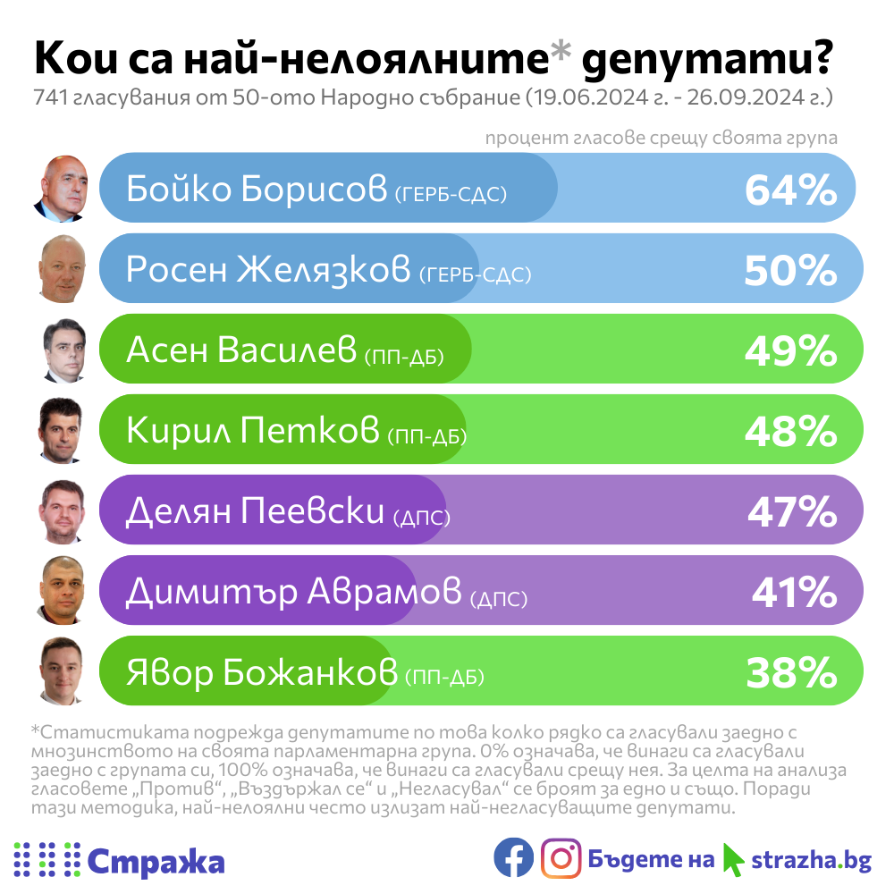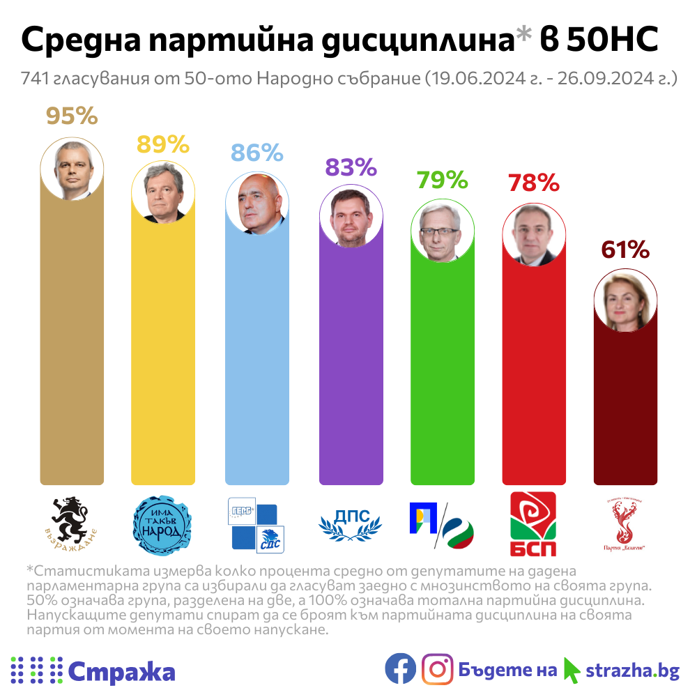 ГЕРБ-СДС са единни в 86% от случаите, ДПС в 83%, а ПП-ДБ в 79%. Разединени остават и „БСП за България“ (78%), а най-недисциплинирани са „Величие“ (61%).