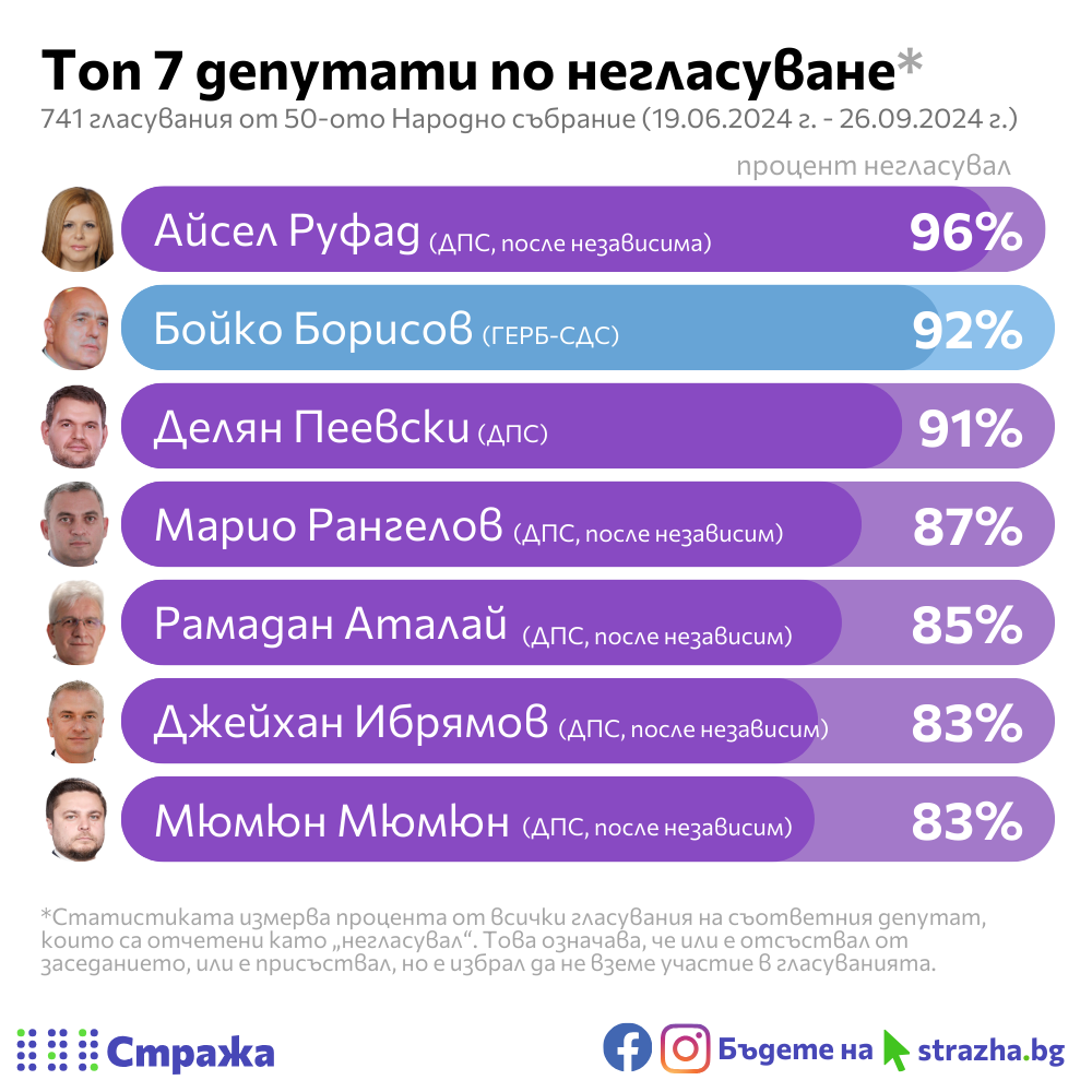 В тези данни виждаме, че от топ 7 негласуващи депутати, 5 са от напусналите ДПС, а другите двама са Бойко Борисов и Делян Пеевски.