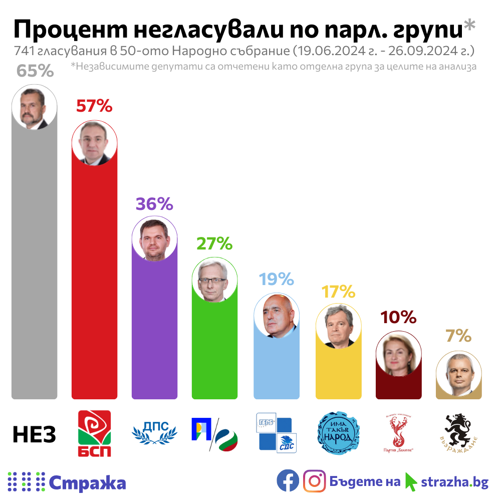 И петимата най-негласуващи от независимите народни представители са бивши отцепници от ДПС, докато най-малко отсъствия има при депутатите от „Възраждане“.