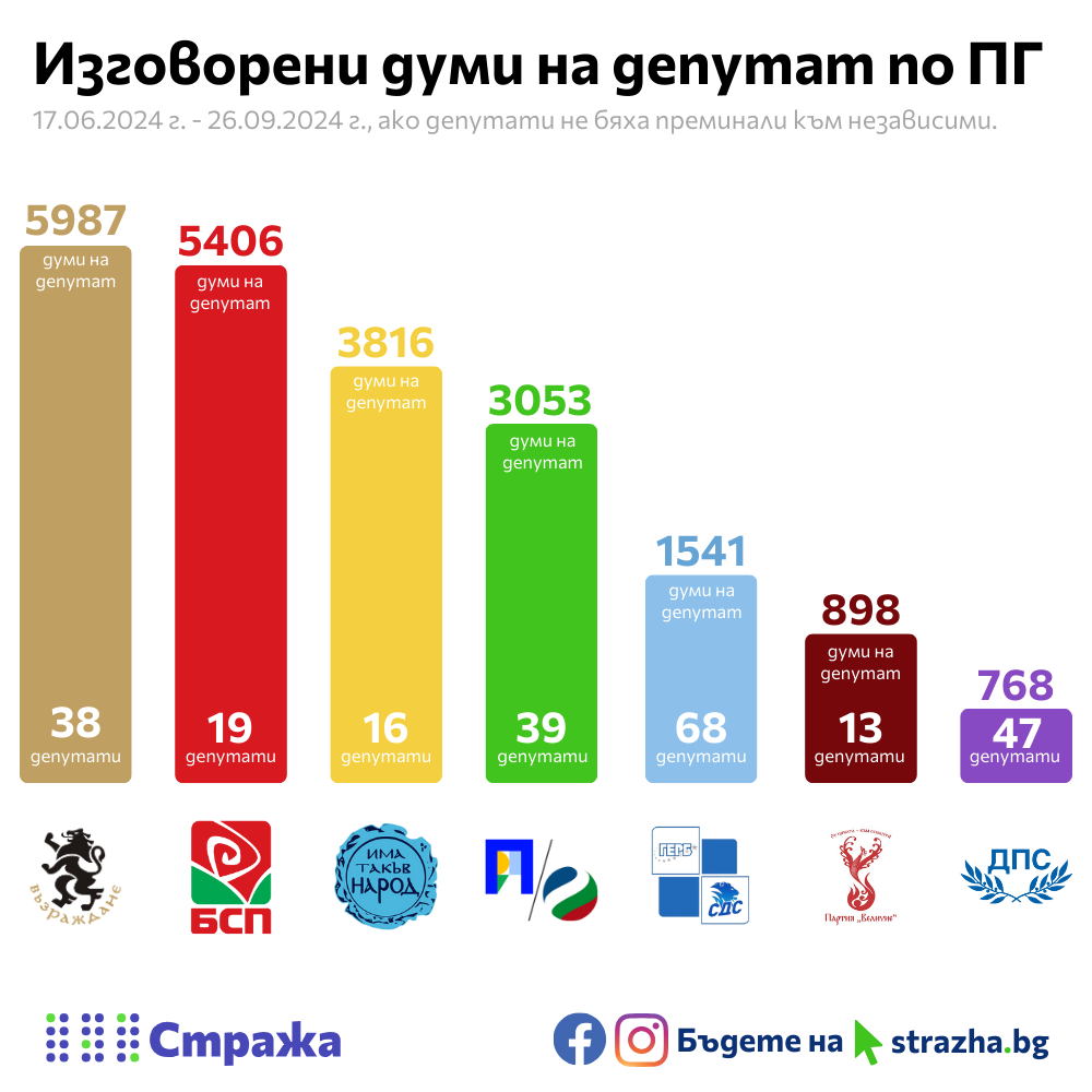 Корелация, обаче, забелязваме при други партии. Партията на Костадин Костадинов изговаря средно 5987 думи на депутат (най-много), а отсъствията ѝ от пленарната зала са 7% (най-малко). Такава корелация виждаме и при ИТН (3816 думи на депутат, трета позиция по изговорени думи, трета позиция по най-малко отсъствия).