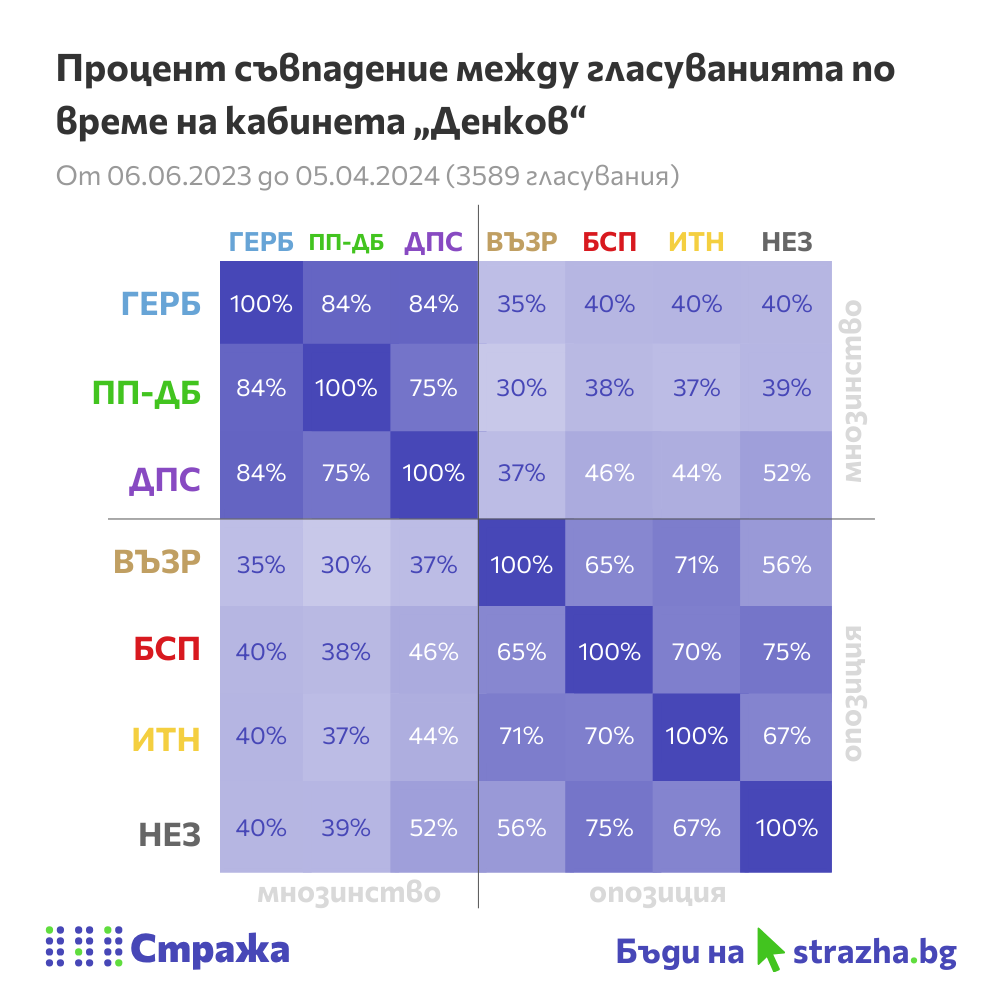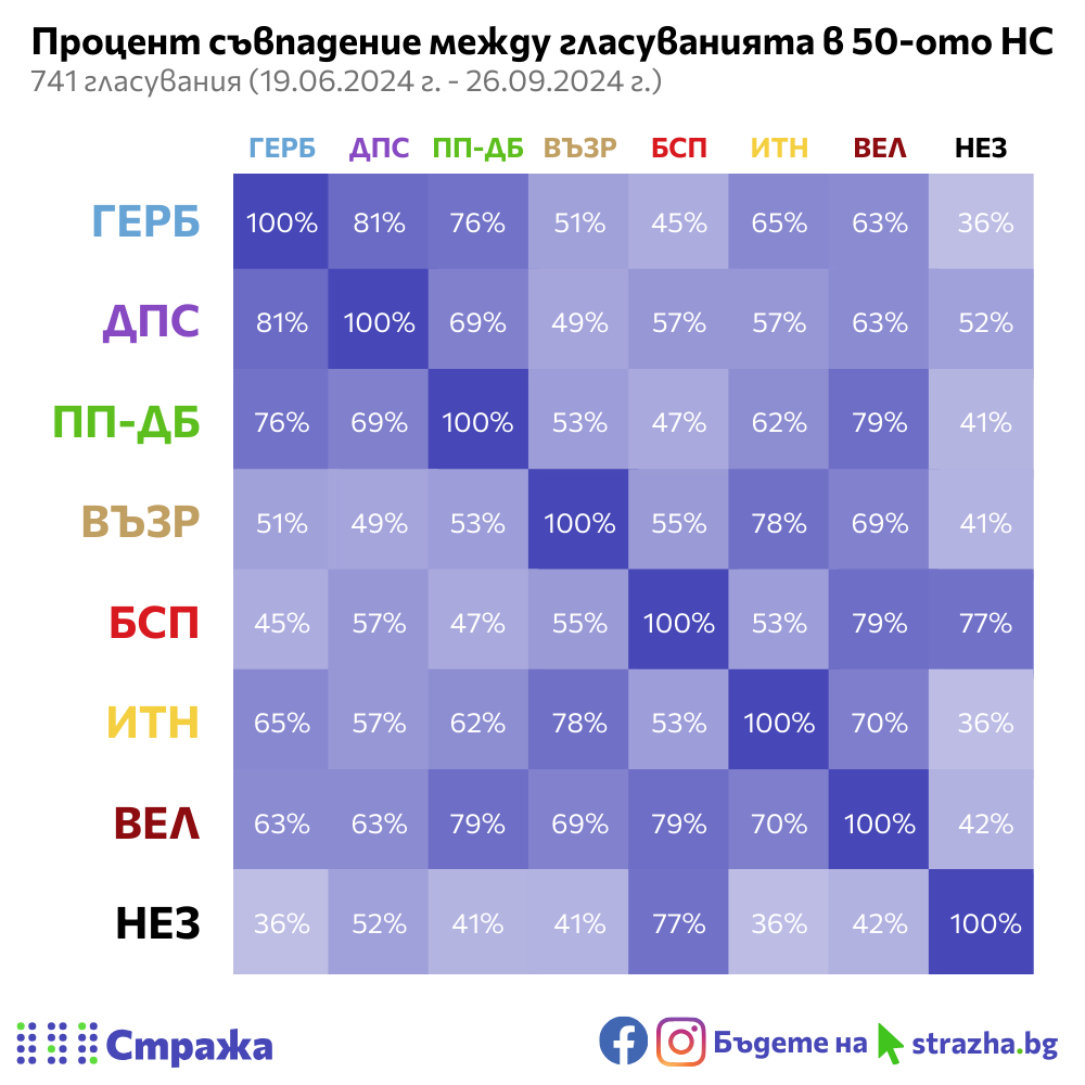 Подобно на предишния, и в 50-ия парламент най-високият процент съвпадение е между ГЕРБ-СДС и ДПС, които гласуват заедно в 81% от случаите. Изненадващо след тях са ПП-ДБ и „Величие“ и „БСП за България“ и „Величие“, които гласуват заедно в 79% от случаите.