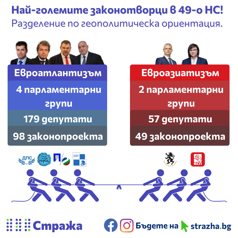 От друга страна имаме евроазиатиците. Те разполагаха с 2 парламентарни групи, 57 депутати и 49 внесени законопроекта.