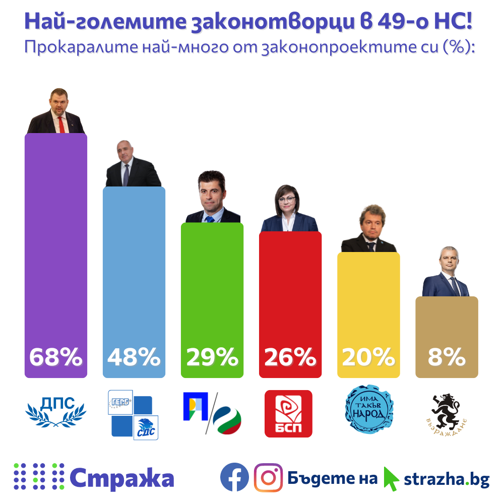 Също така се разбива и тезата, че по-честа законодателна активност води до по-голяма успеваемост. ДПС, които бяха най-тихи от плаващото мнозинство в 49-ото Народно събрание, успяват да прокарат 68% от законопроектите, в които участват. Това е с 39% повече от ПП-ДБ (29%), които са първенци по внесени закони.