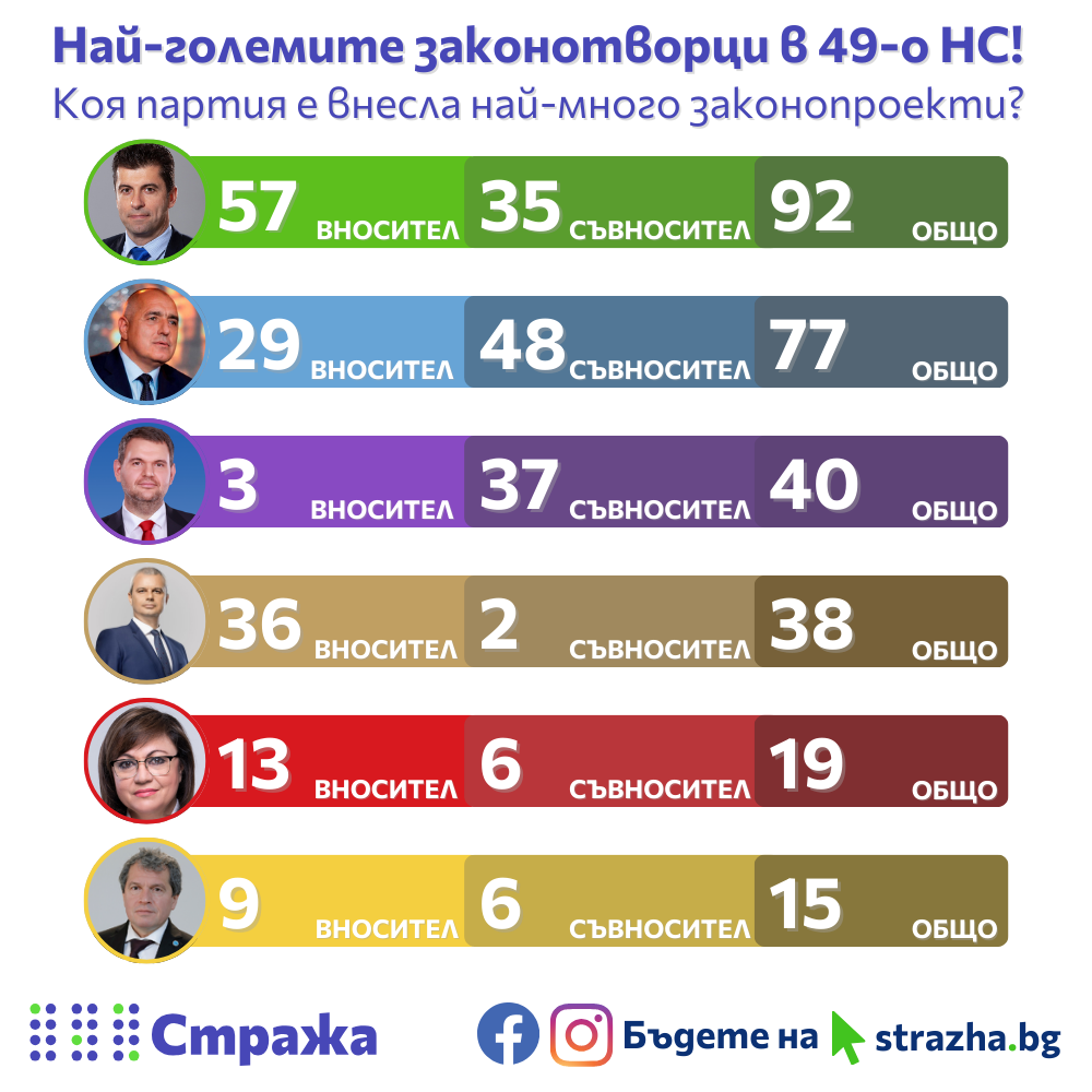 Поглеждайки инфографиката, партиите са подредени спрямо изборните си резултати, с изключение на ГЕРБ-СДС и ПП-ДБ, които са разменени. Но дали голямото участие в създаването на законопроекти означава и задължително голям успех?