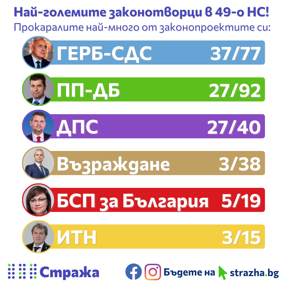 Макар че ПП-ДБ са най-активни по отношение на внесени законопроекти, ГЕРБ-СДС доминират по приети количествено (37 / 77 > 27 / 77).