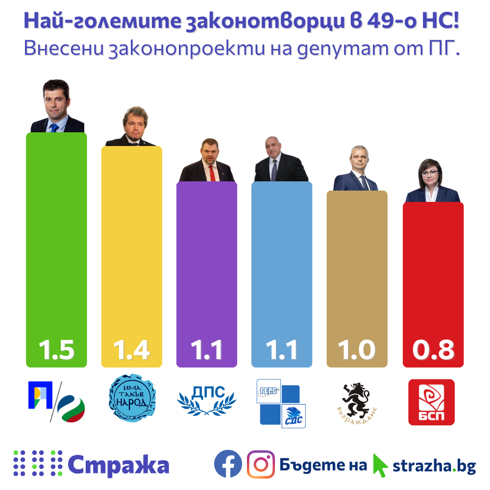 Наравно се нареждат групите на ГЕРБ-СД и ДПС с по 1.1 законопроекта на депутат. На последните две места се нареждат Възраждане с 1 законопроект на народен представител и БСП за България с 0,8.