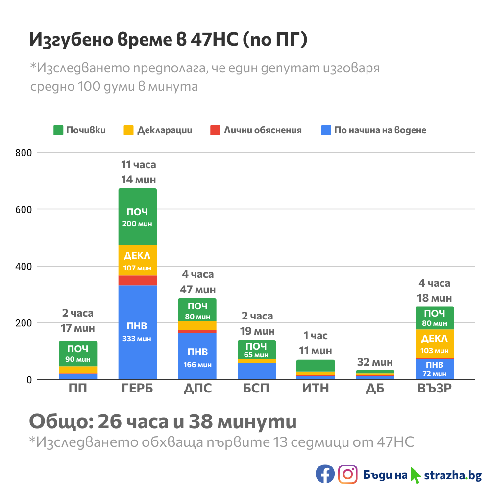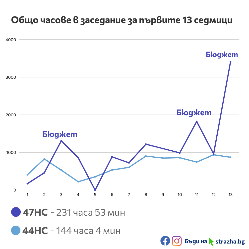 Само за 13 седмици 47-ото НС е навъртяло 231 часа и 53 минути в пленарната зала, което е с 87 часа и 49 минути повече от 44-тото НС за същия период от време. Разликата се дължи на няколкото маратонски заседания, в които на дневен ред е било обсъждането и гласуването на Бюджет 2022. Най-дългото от тях бе на 23 срещу 24 февруари и продължи повече от 20 часа.