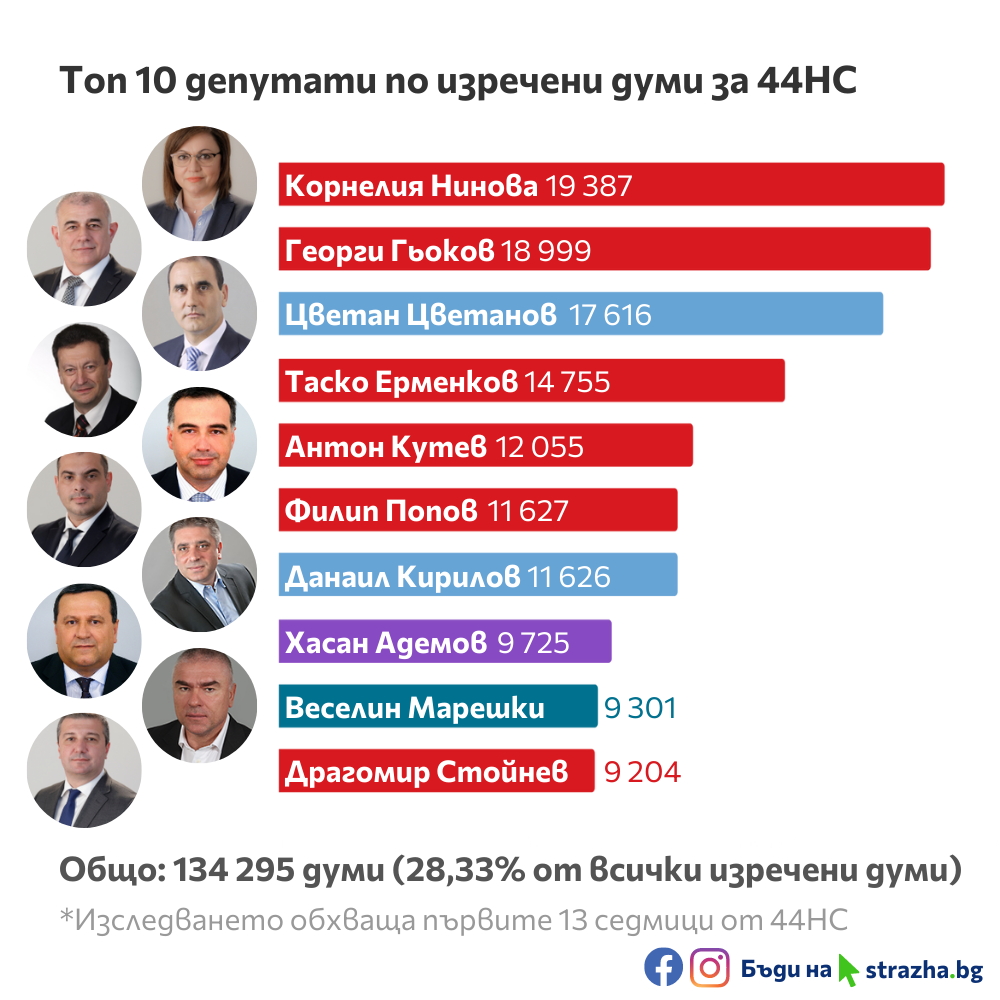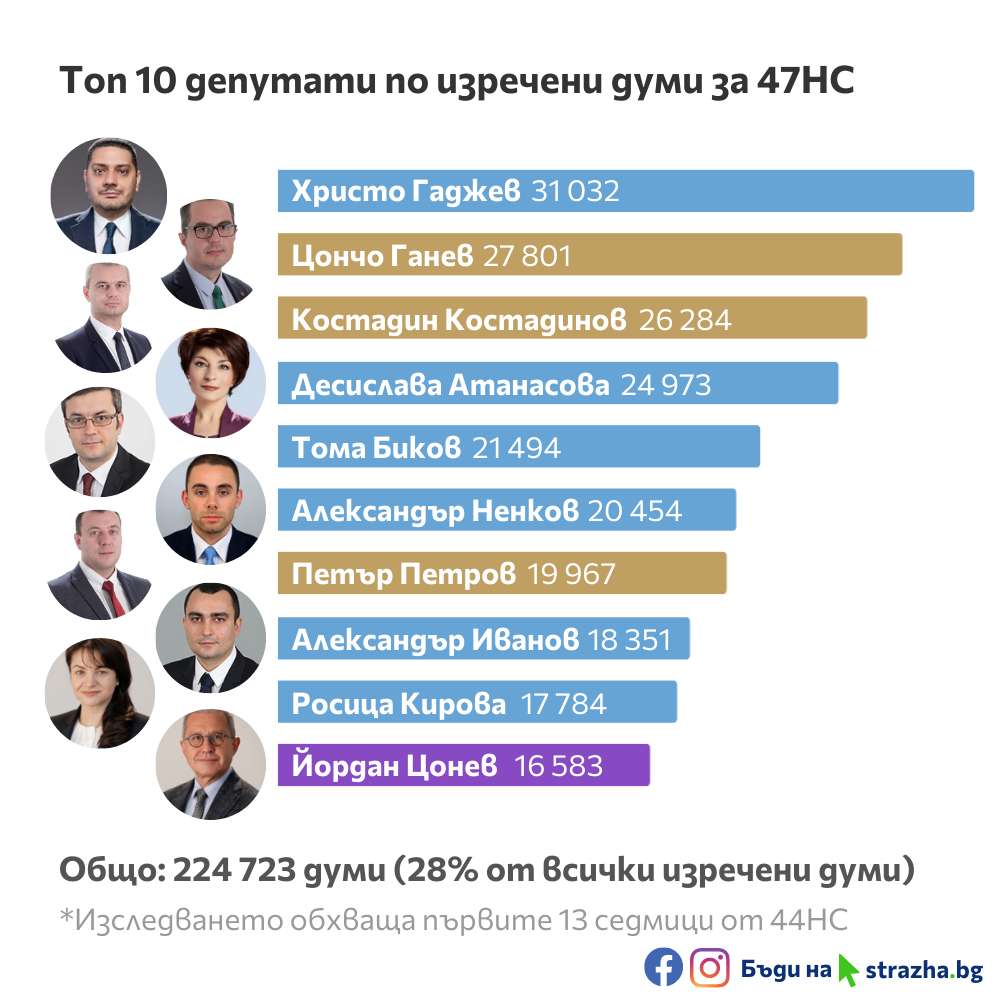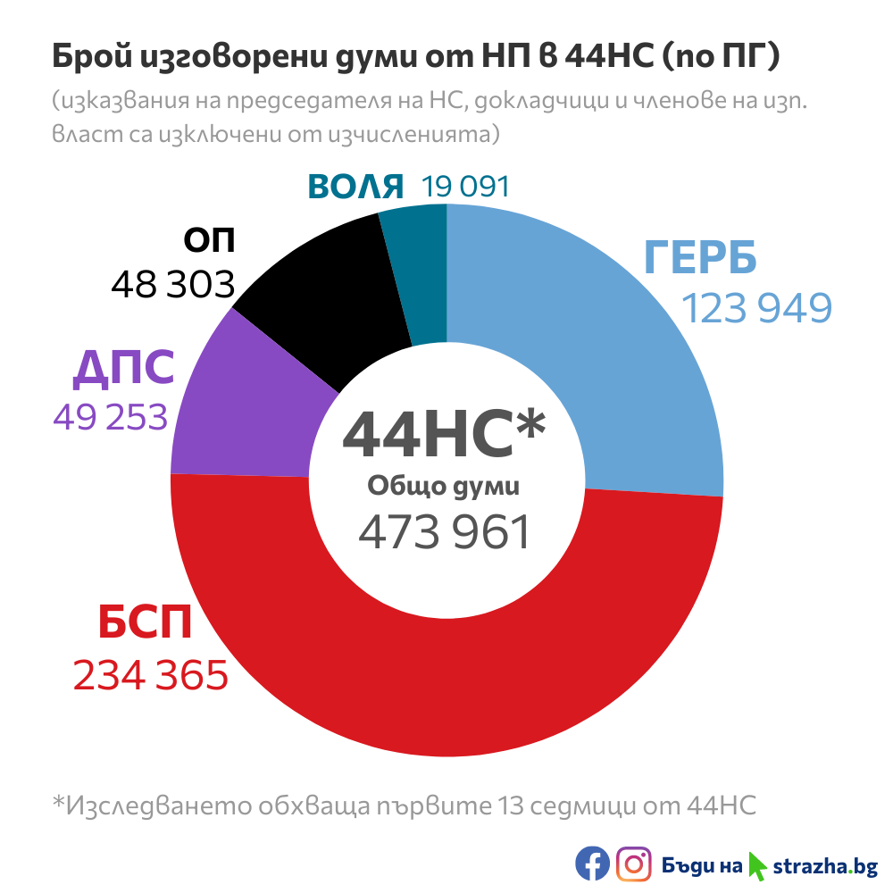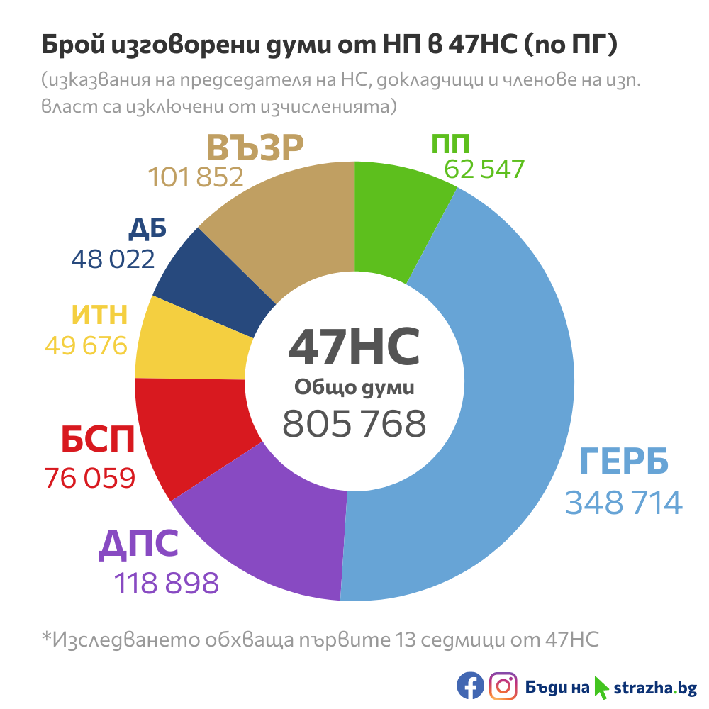 Същото, но в по-голяма степен, наблюдаваме и в 47-ото НС, където депутатите от ГЕРБ-СДС са изговорили с 47% повече думи от колегите им в парламентарните групи на „Продължаваме промяната“, „БСП за България“, „Има такъв народ“ и „Демократична България“. Включвайки опозиционно настроените ДПС и „Възраждане“ в това сравнение, разликата в изговорените думи скача до 140% повече в полза на опозицията!