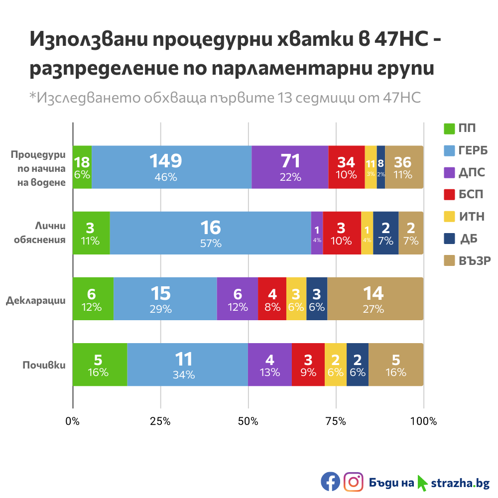 Това става явно от разпределението на депутатите, използвали процедурни хватки в 47-ото НС, като 58% от ПГ на ГЕРБ-СДС, 50% от ПГ на ДПС и 62% от ПГ на „Възраждане“ са се изказвали по начина на водене. Броят на личните обяснения, декларации и почивки по искане на ПГ на опозицията също е по-голям от съответния брой на управляващото мнозинство.